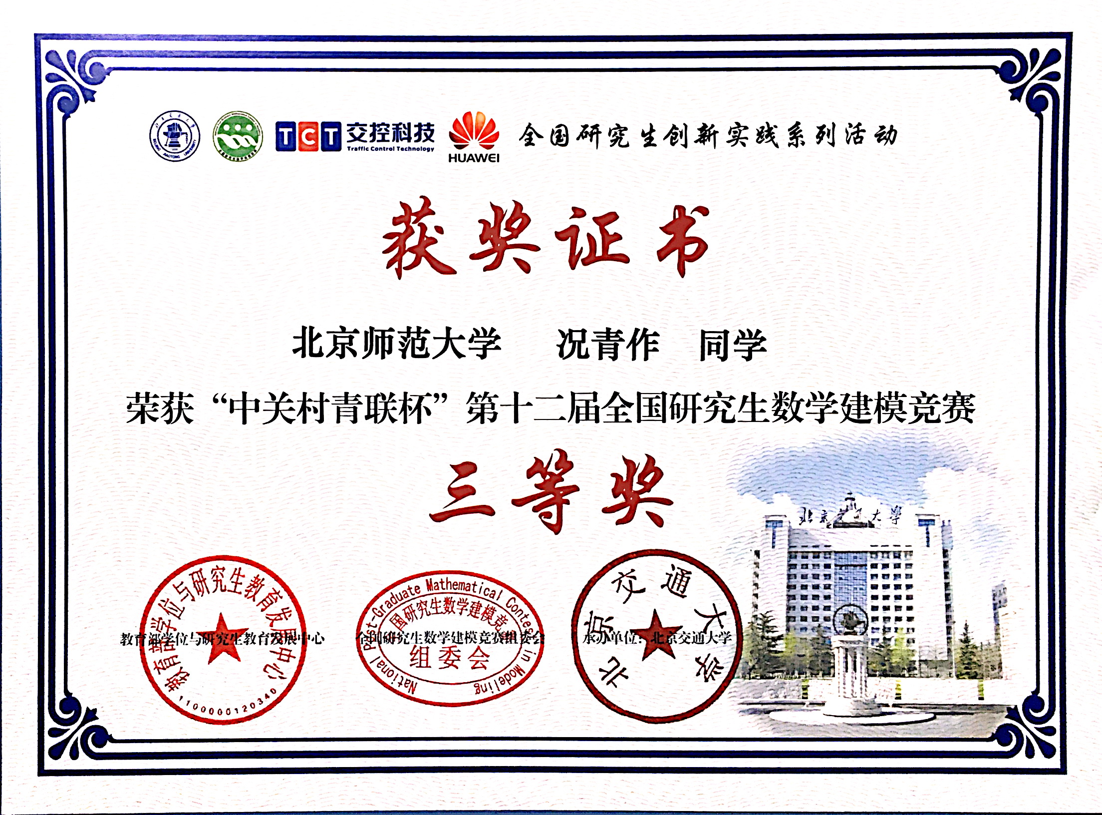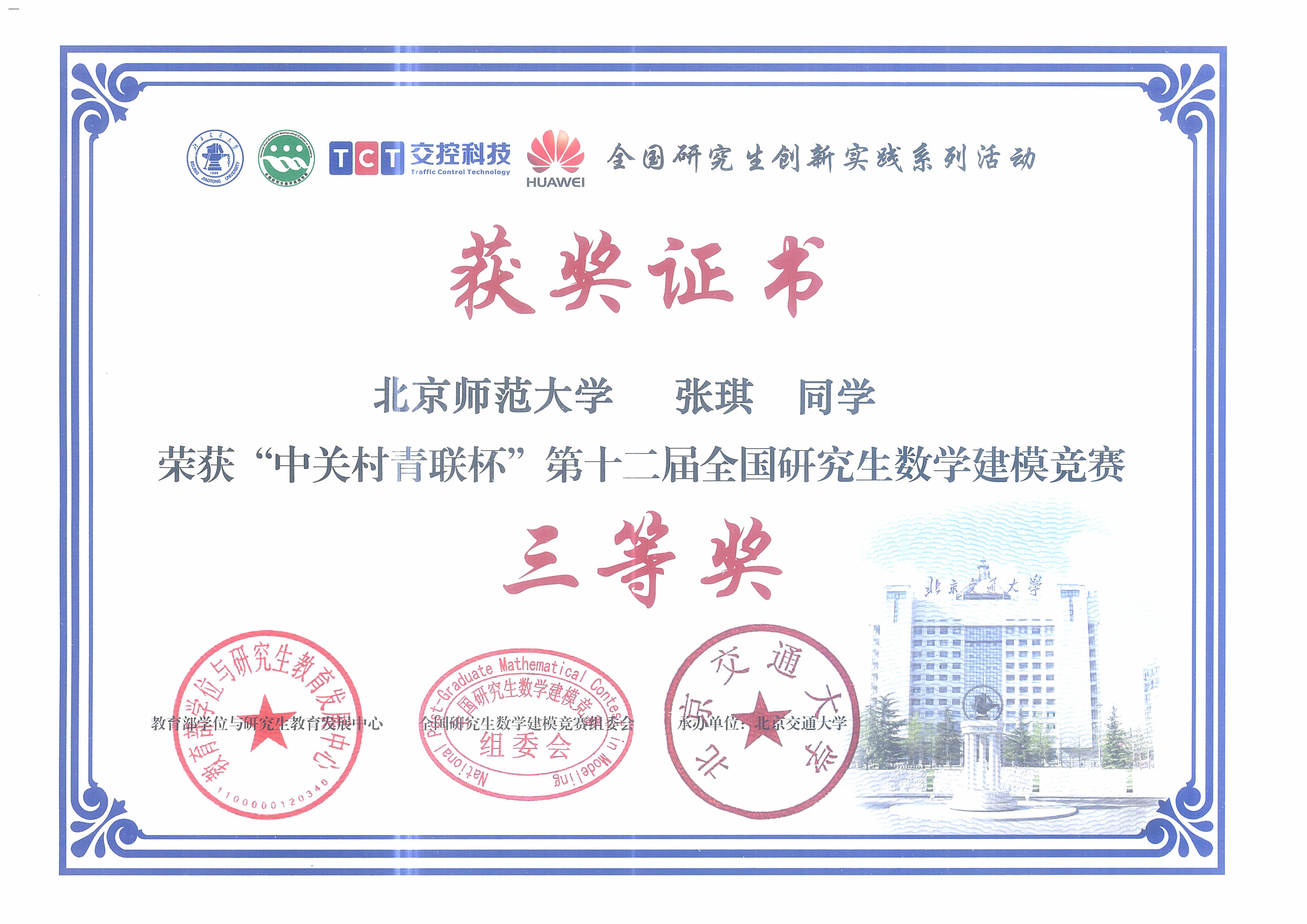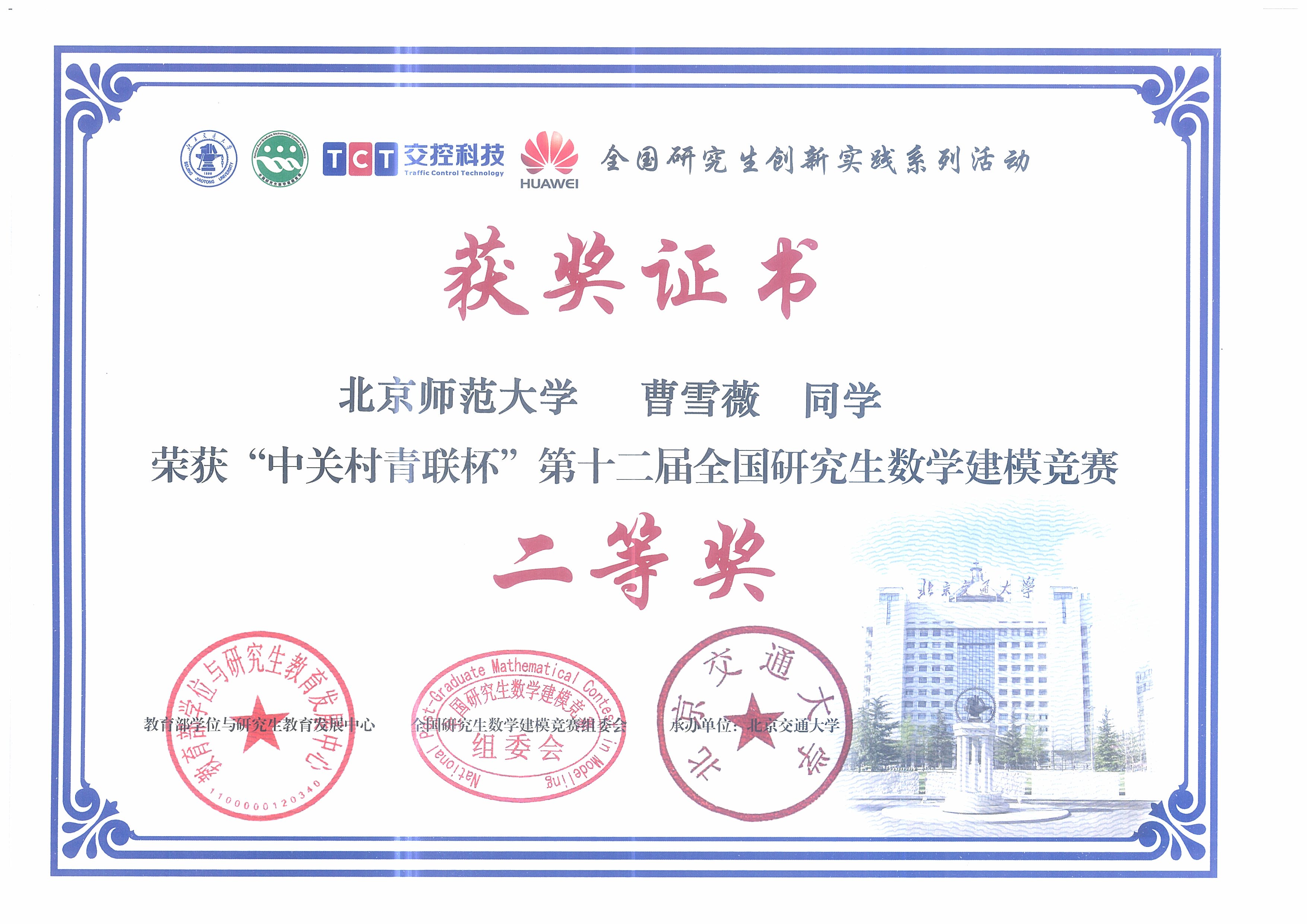 2015年12月,在“中关村青联杯”第十二届全国研究生数学建模竞赛中,91在线-国产在线-成人影院 硕士研究生曹雪薇、马玉财荣获二等奖,况青作、张琪和周幻园荣获三等奖。