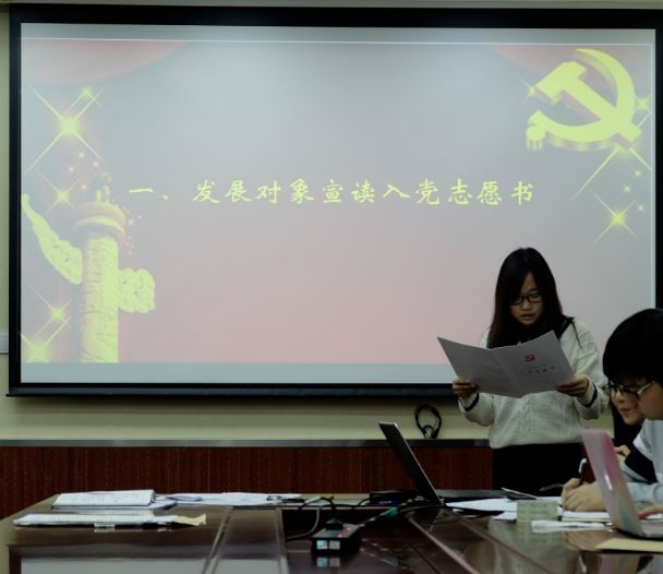 大会开始之后,首先全体起立,唱国际歌。然后根据接受预备党员会议流程,三名发展对象逐一宣读了入党志愿书,表明了自己加入共产党的决心。支部大会讨论过程中,三名发展对象的入党介绍人分别介绍了三位同学在日常学习和生活中的表现以及存在的优缺点,表明三位同学符合党员标准;随后支委会报告了对发展对象的审查情况;与会党员发表意见的过程中,在场的教师和同学除了对三位发展对象的日常表现做出肯定之外,还向三位发展对象提出了很多问题,比如狄增如老师提到“如何看待党的发展中经历的许多挫折和磨难”,蔡维老师提到“结合十八大召开的背景,有没有感觉现在入党是一个入党的好的时机”等,三位发展对象认真的回答了这些问题,这些问题也引起了在场党员们的思考。随后正式党员投票表决,最终组织委员刘艳老师宣布支部决议,三名同学正式成为预备党员。