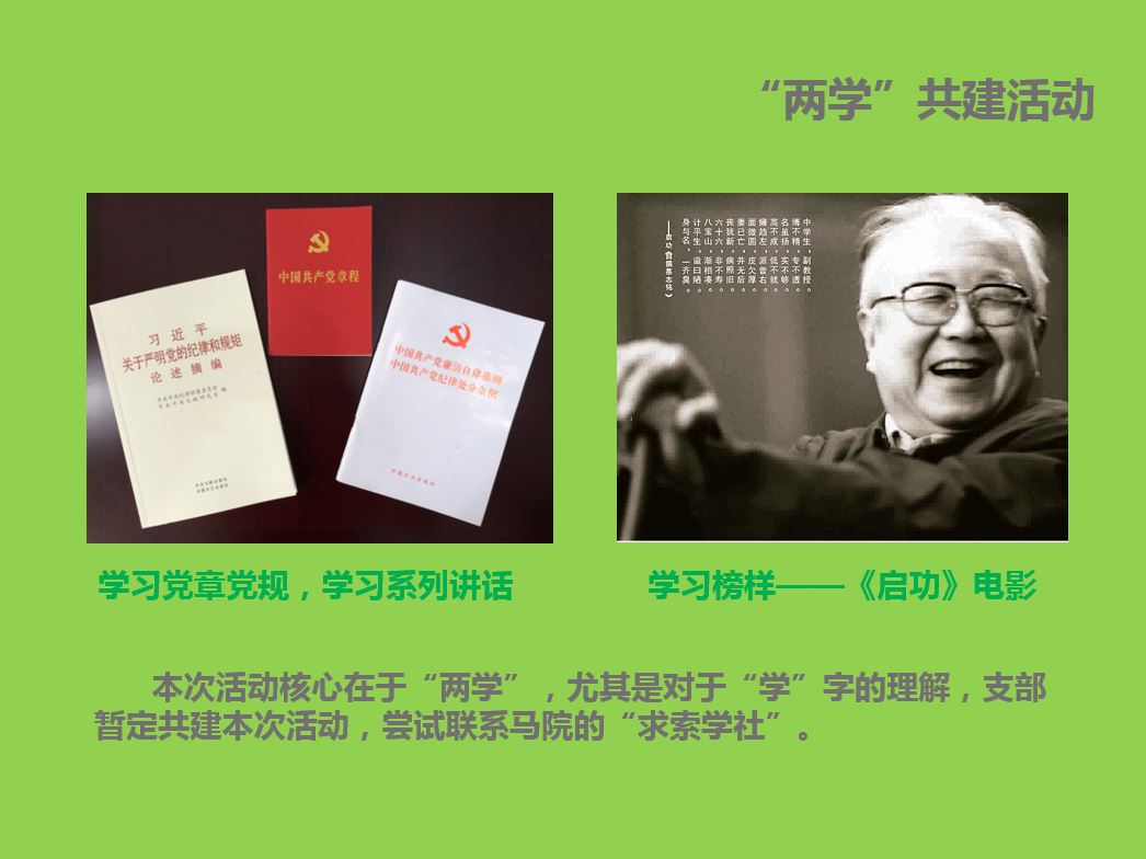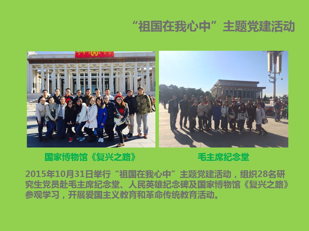 2016年,91在线 研究生党支部按照中央要求和学校总体部署,将党建创新工作作为重点,以“深入开展‘两学一做’切实提高党性修养”为主题,在“党员先锋”工程和“党旗引航”计划的基础上,深入贯彻落实“两学一做”学习教育活动。围绕学党章党规、学系列讲话、做合格党员、学雷锋月及纪念建党95周年等主题广泛开展有特色、有内涵、有层次、有规模的党建活动,着重培养广大研究生党员的政治意识、大局意识、核心意识和看齐意识,切实加强党员教育管理与基层组织建设,不断提升研究生党建工作科学化、规范化水平,积极促进党员同学成长成才。